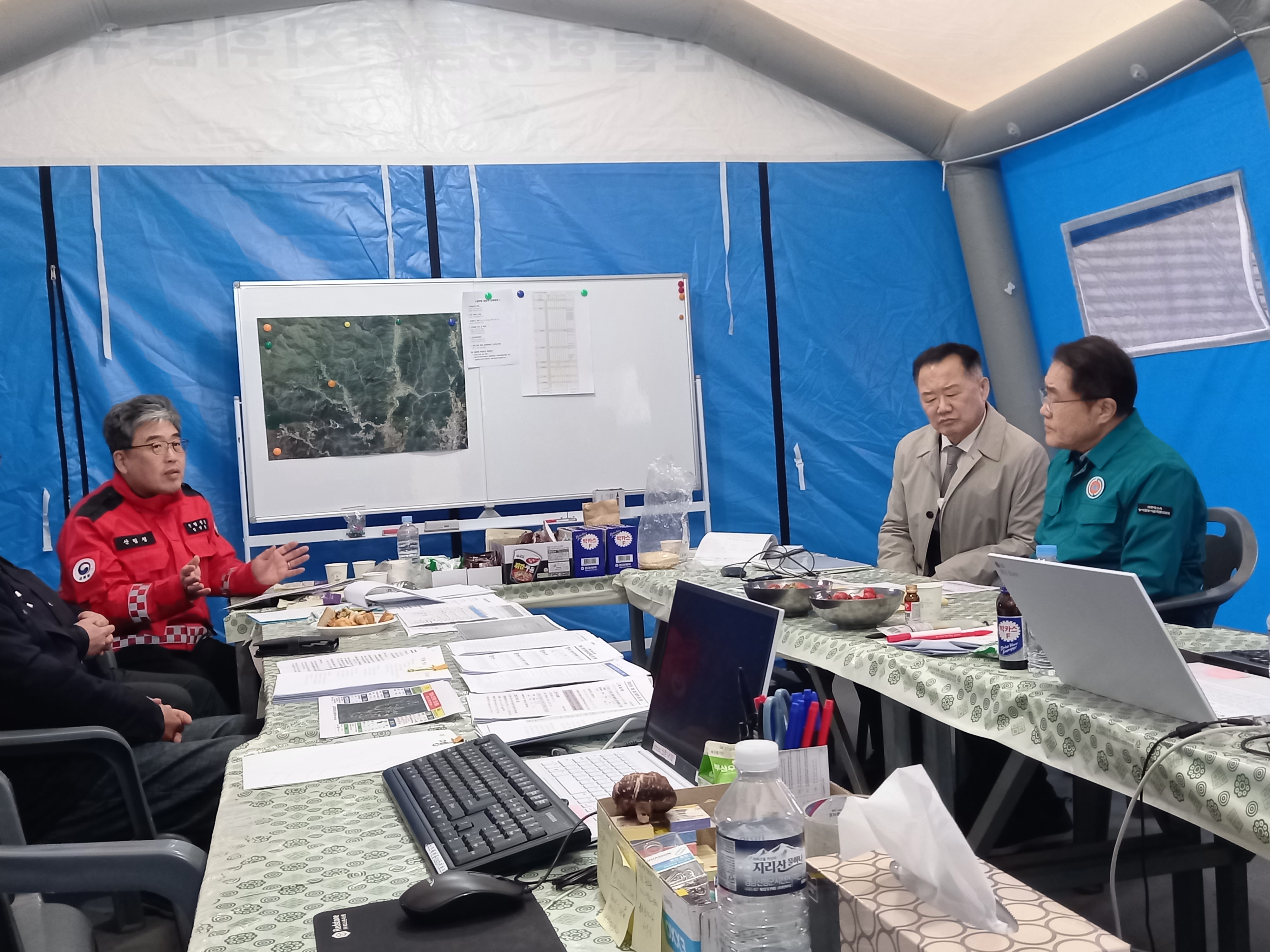 이날 장 위원장은 경남 산청군에 설치된 산림청 산불통합지휘본부를 방문하여 임상섭 산림청장 등과 진화 상황을 점검하고, 밤낮없이 산불과 사투를 벌이고 있는 산불진화대원 및 관계자들을 격려했다. 이 자리에는 신성범(경남·함양·거창·합천) 국회의원, 이승화 산청군수도 함께했다.