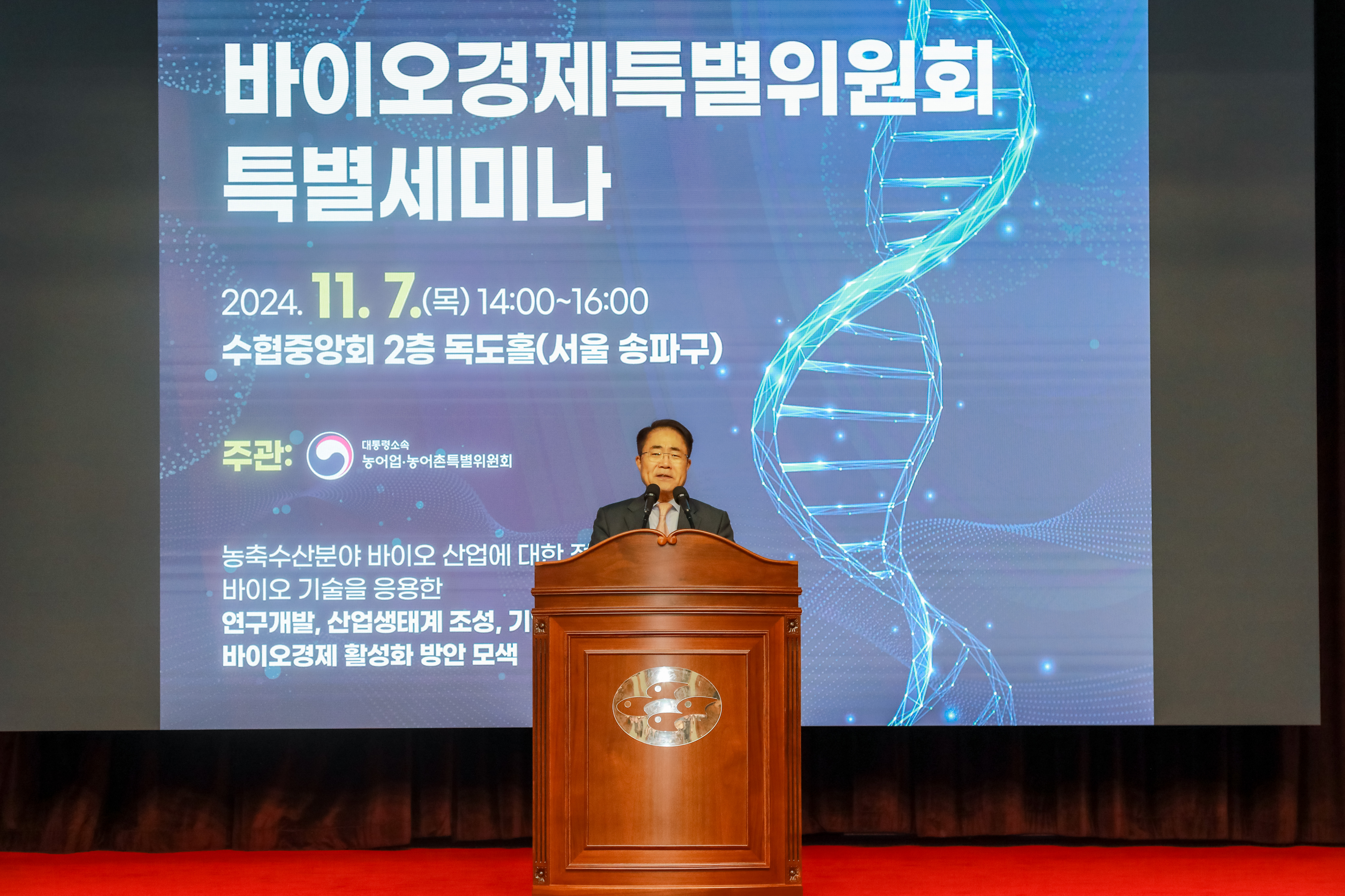 대통령소속 농어업‧농어촌특별위원회(이하 농어업위, 위원장 장태평)는 11월 7일(목) 14시 수협중앙회 2층 독도홀(서울 잠실 소재)에서 ‘바이오경제특별위원회 특별세미나’를 개최하였다.