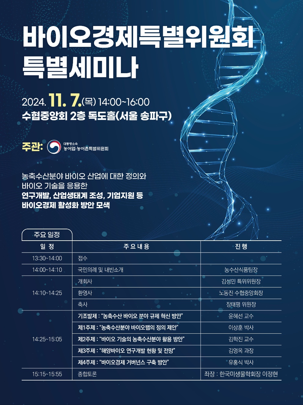 대통령소속 농어업‧농어촌특별위원회(이하 농어업위, 위원장 장태평)는 오는 11월 7일(목) 14시부터 수협중앙회 2층 독도홀(서울 잠실 소재)에서 “바이오경제특별위원회 특별세미나”를 개최한다.