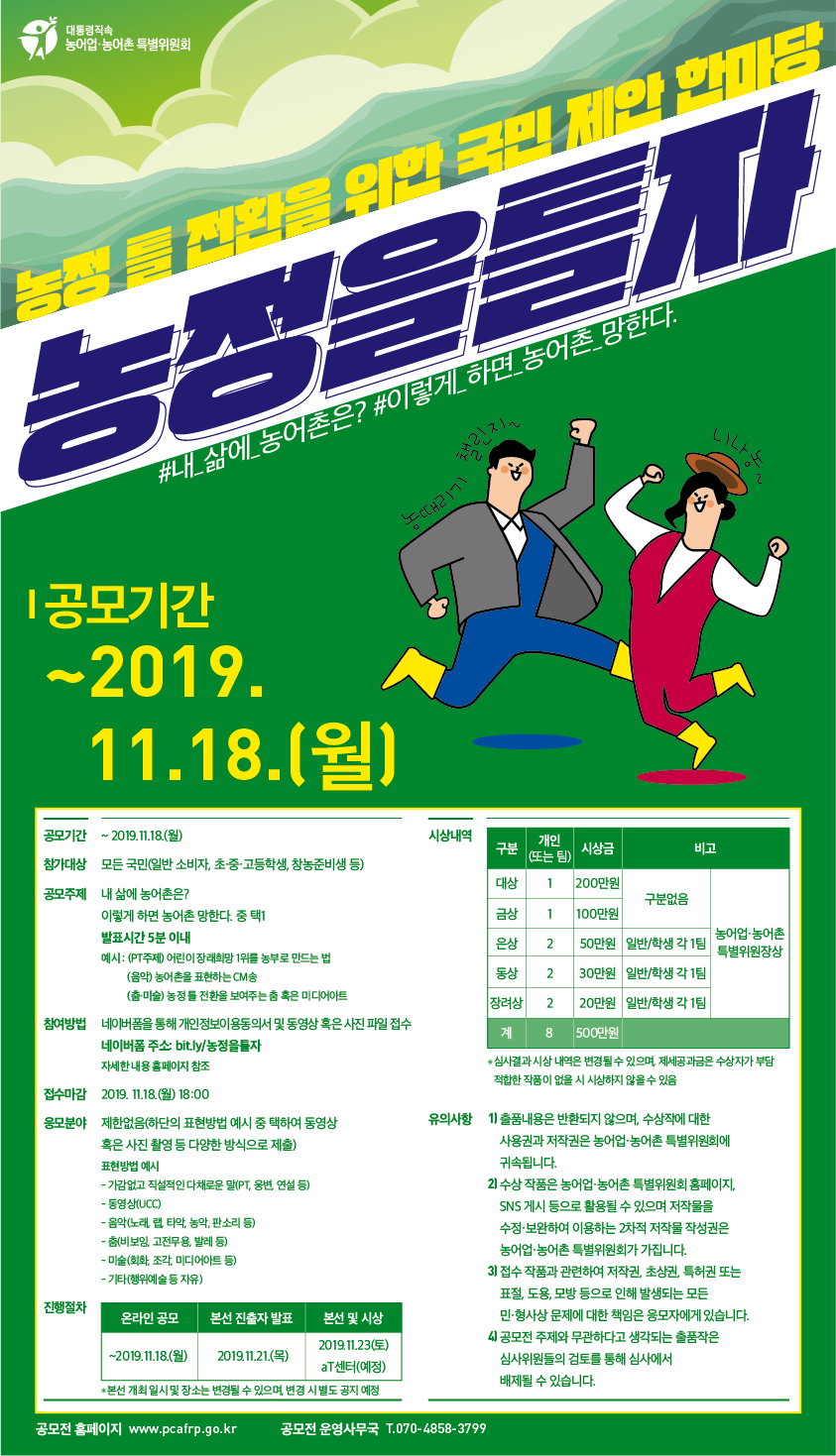 1) 출품 내용은 반환되지 않으며, 수상작에 대한 사용권과 저작권은 농어업·농어촌 특별위원회에 귀속됩니다.