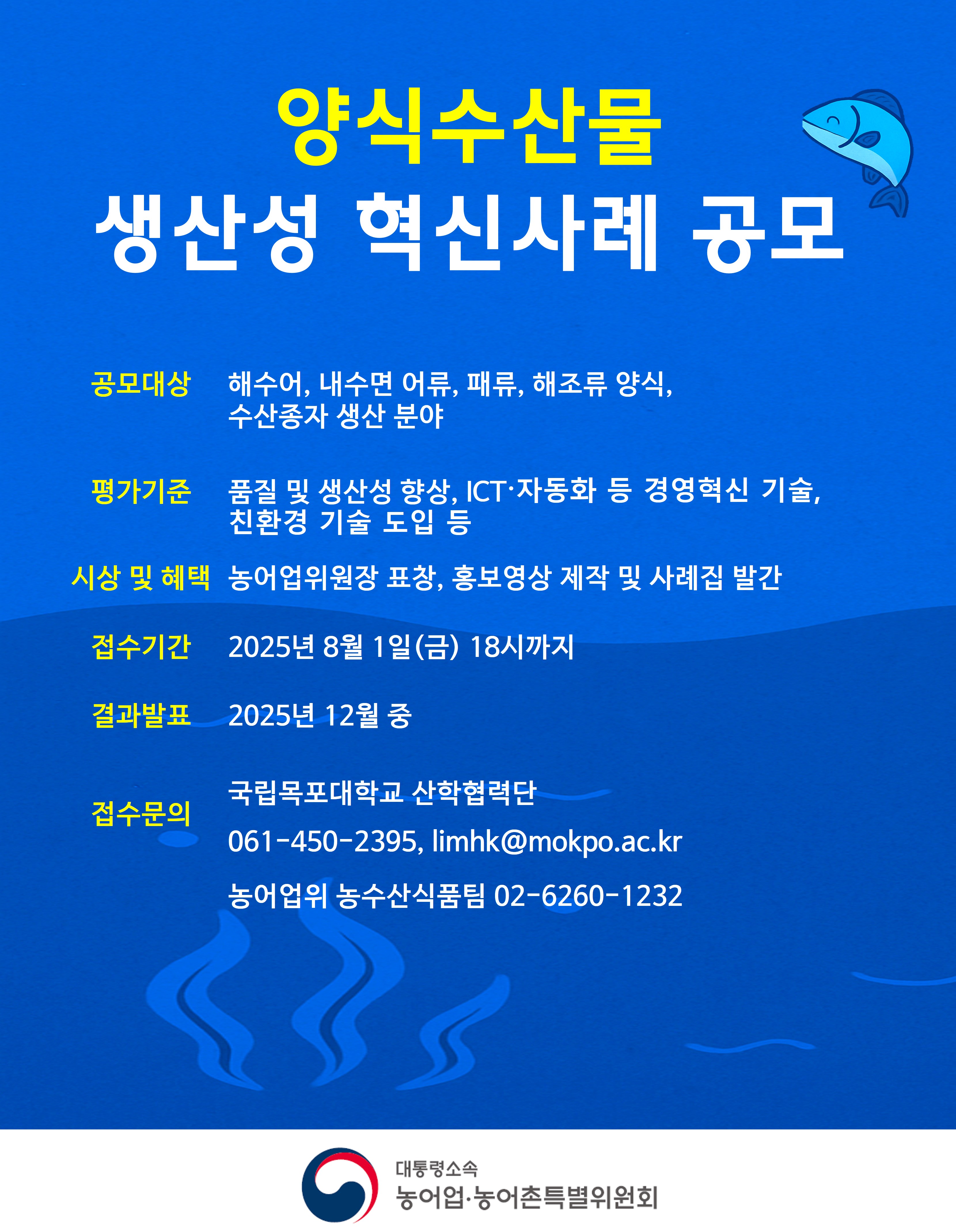 대통령소속 농어업·농어촌특별위원회(위원장 장태평, 이하 ‘농어업위’)는 고수온과 같은 해양환경 변화와 생산비 증가 등으로 어려움을 겪고 있는 양식어업의 위기 극복을 위해, ‘양식수산물 생산성 혁신 사례’ 공모를 2025년 8월 1일까지 진행한다.