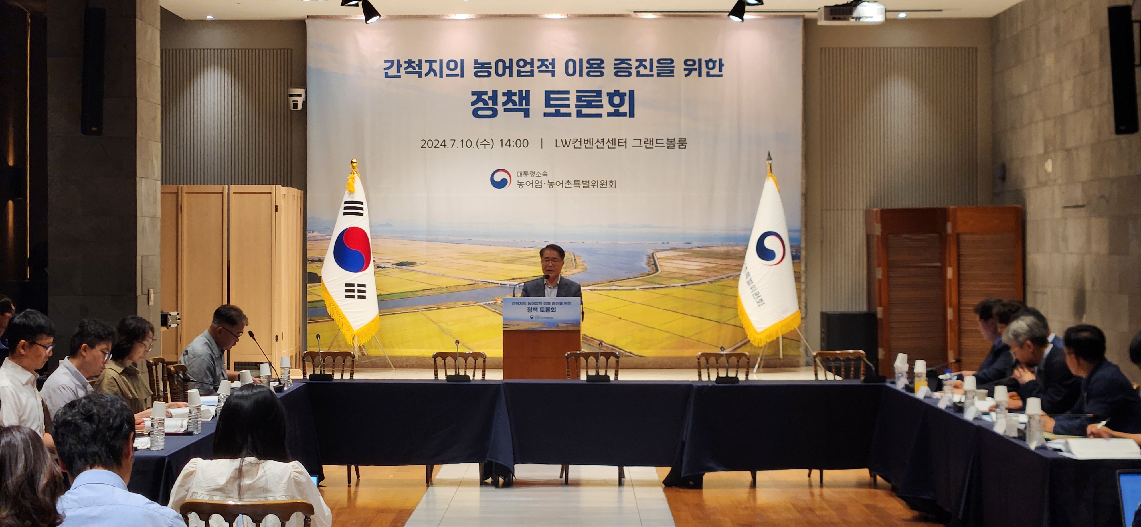 대통령소속 농어업·농어촌특별위원회는 7.10(수) 「간척지의 농어업적 이용 증진을 위한 정책 토론회(이하 ‘토론회’)」를 개최했다. 이번 토론회는간척지의 효율적 활용 방안을 모색하고, 미래 지향적인 농어업 정책 수립을 위한 다양한 의견을 수렴하기 위해 마련되었다.