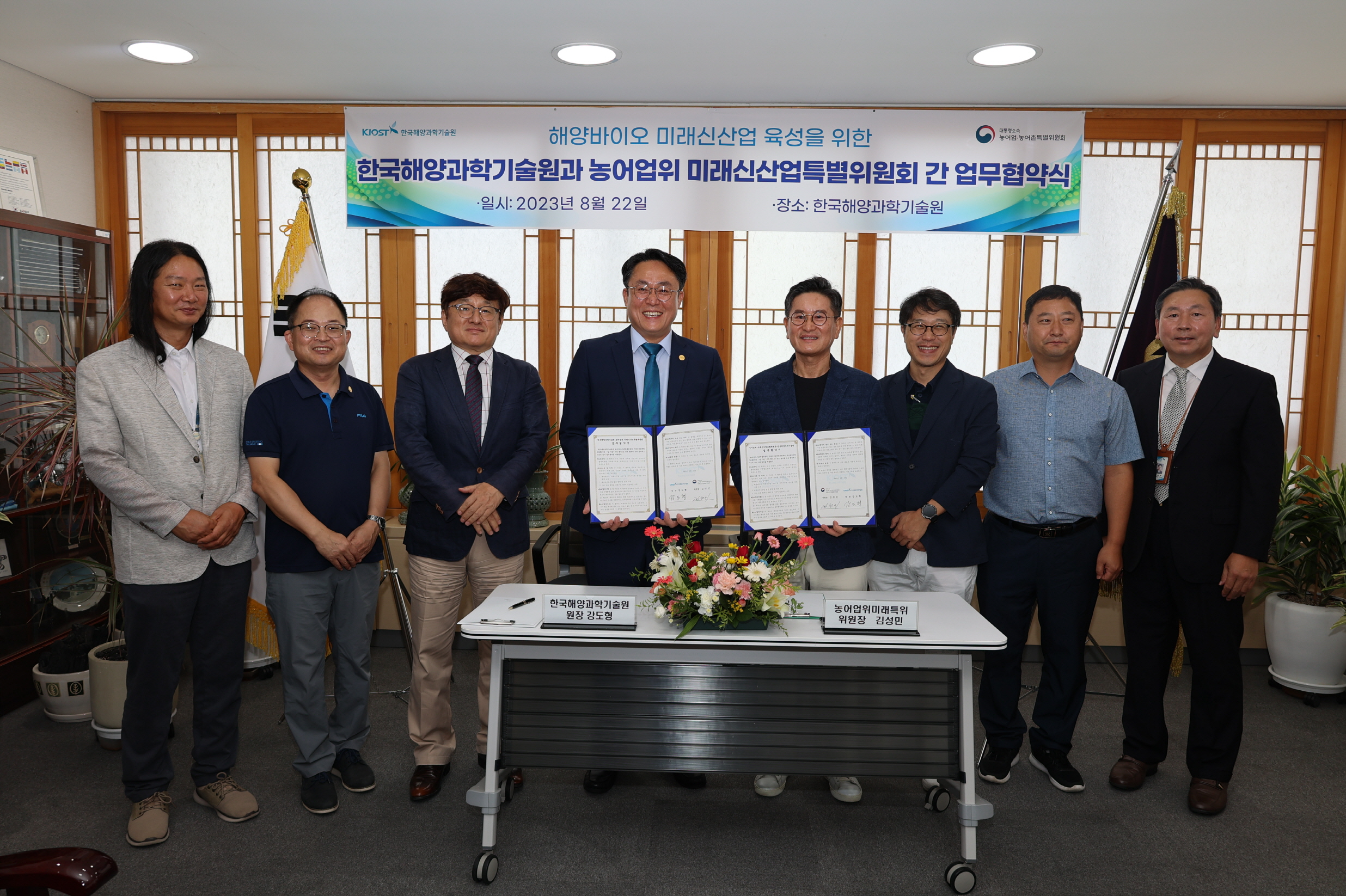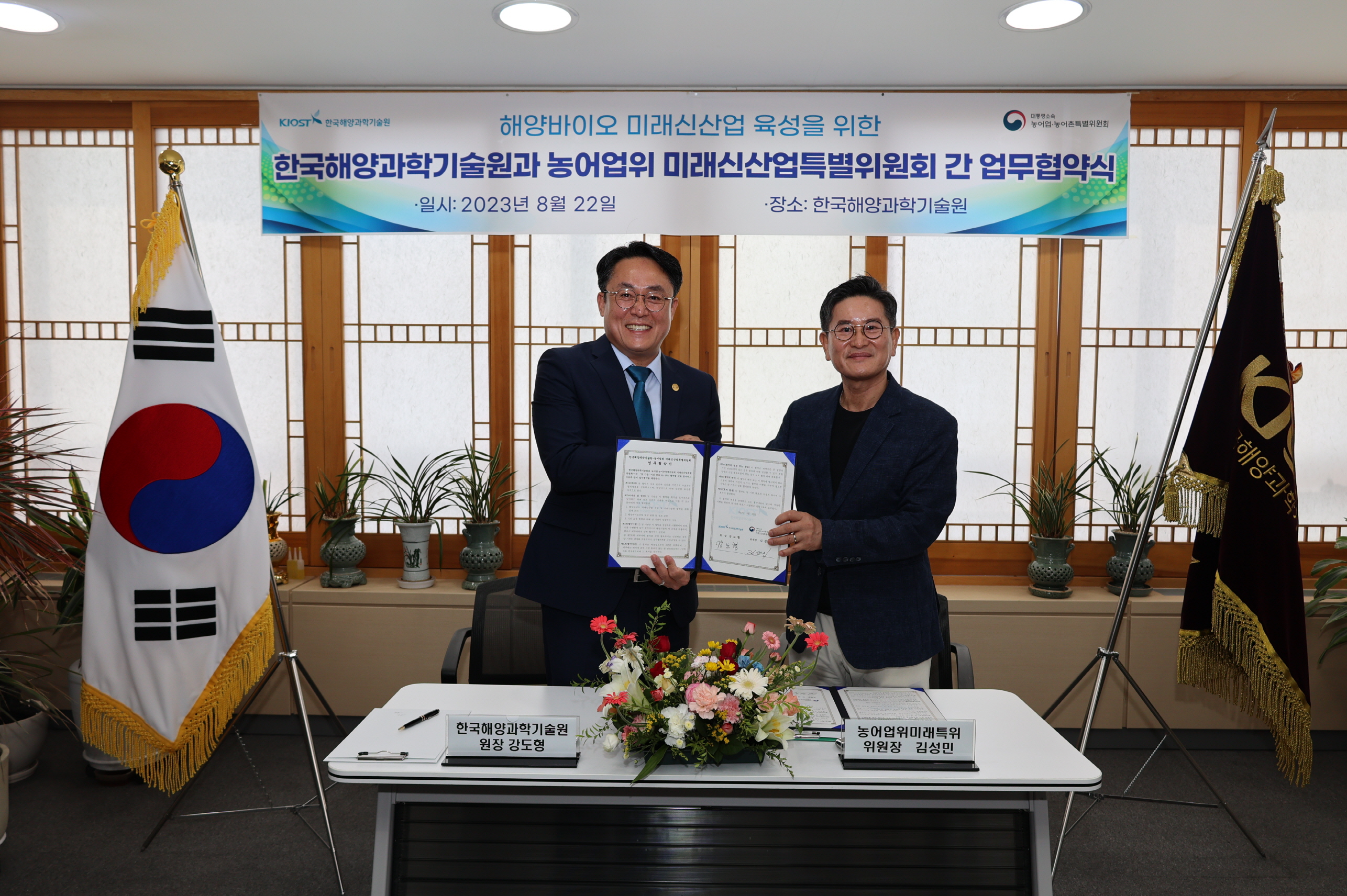 대통령소속 농어업·농어촌특별위원회(위원장 장태평, 이하 농어업위) 미래신산업특별위원회(이하 미래신산업특위)는 한국해양과학기술원(원장 강도형, 이하 KIOST)과 함께 8월 22일(화) KIOST 부산 본원에서 ‘해양바이오 산업의 지속가능한 발전과 미래신산업 육성’을 위한 업무협약을 체결했다고 밝혔다.