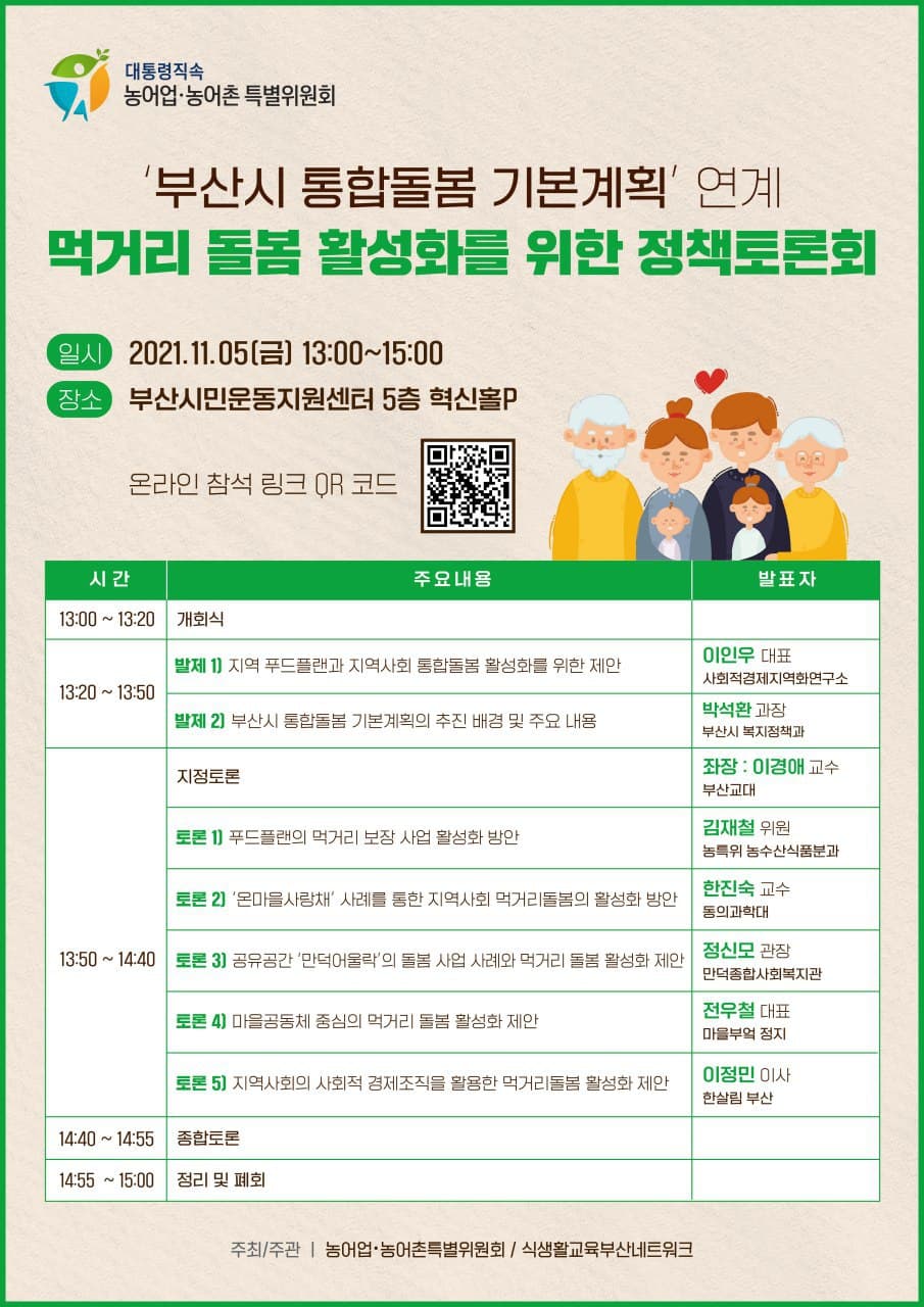 □ 대통령직속 농어업·농어촌특별위원회(이하 농특위, 정현찬 위원장)은 11월 5일(금) 13시, 부산시민운동지원센터 혁신홀에서 ‘먹거리돌봄 활성화를 위한 정책토론회*’를 개최했다.