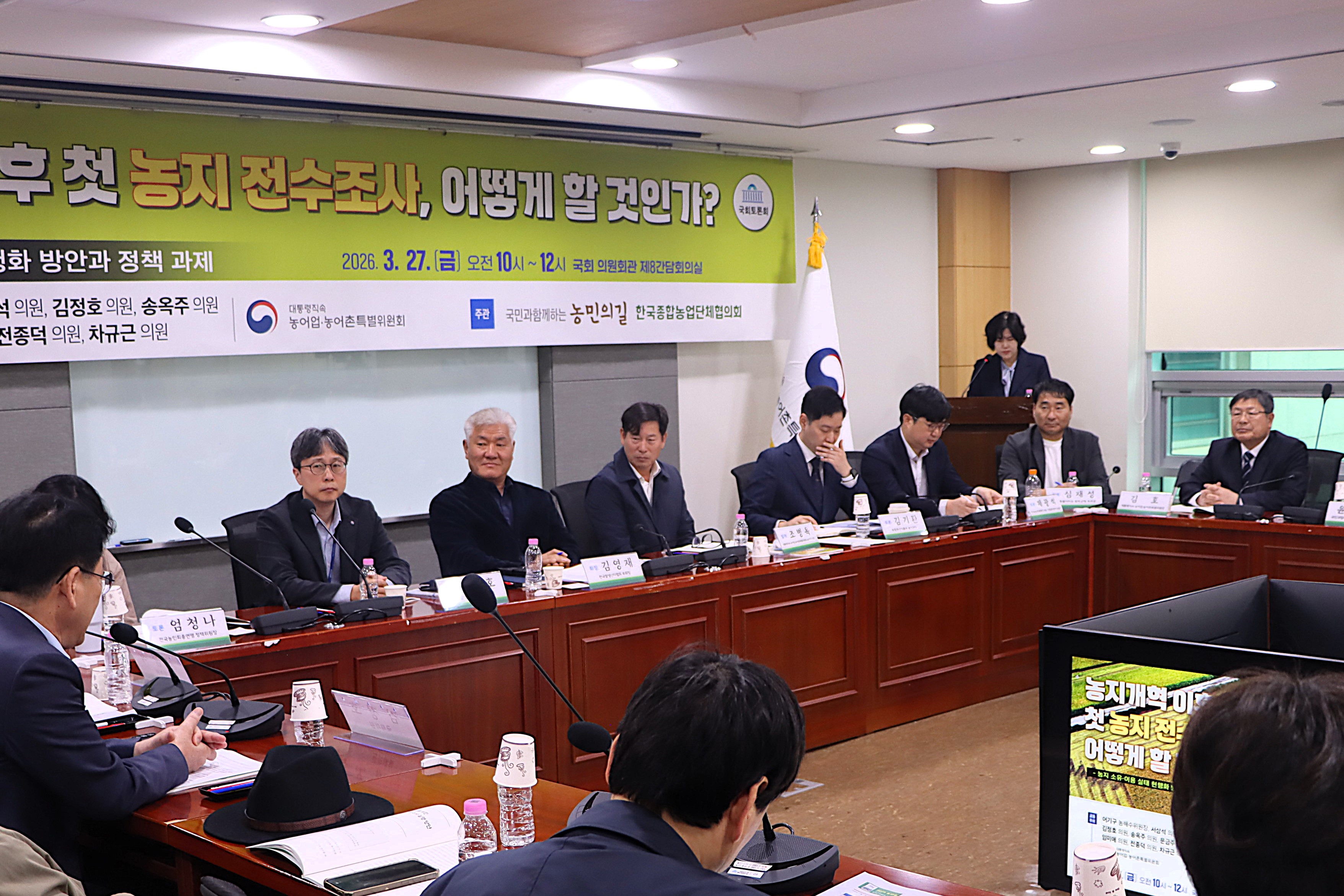 대통령직속 농어업․농어촌특별위원회(위원장 김호)는 3월 27일(금) 국회의원회관 제8간담회의실에서 ‘농지개혁 이후 첫 농지 전수조사, 어떻게 할 것인가?’를 주제로 농지 소유·이용 실태 현행화 방안 마련을 위한 토론회를 개최했다.